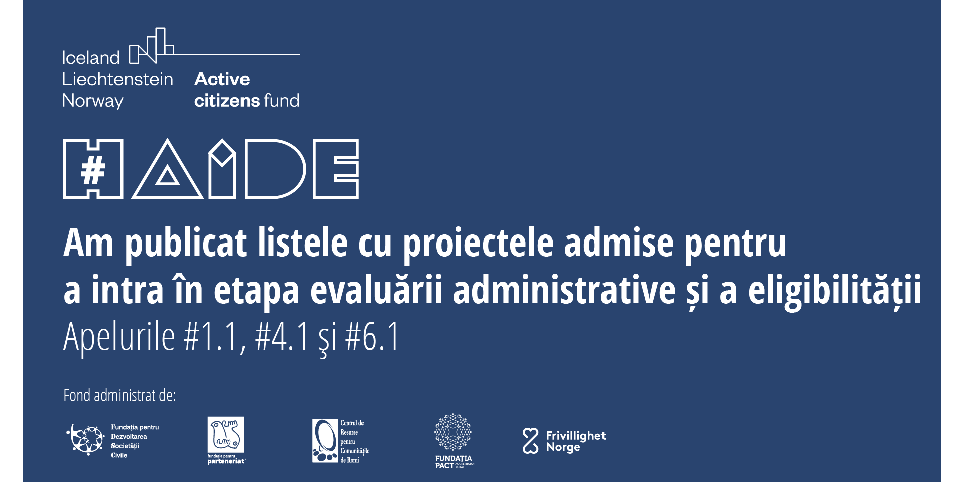 Am publicat listele cu proiectele admise pentru a intra în etapa evaluării administrative și a eligibilității pentru apelurile #1.1, #4.1 şi #6.1, ele sunt disponibile în secțiunea Proiecte în Evaluare (https://activecitizensfund.ro